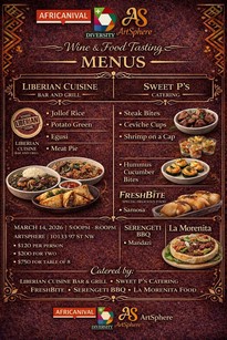 Au menu : Jollof Rice, Egusi, Meat Pie, Samosas, Jerk Chicken… vin rouge… vin blanc… et encore plus de nourriture et de boissons délicieuses !