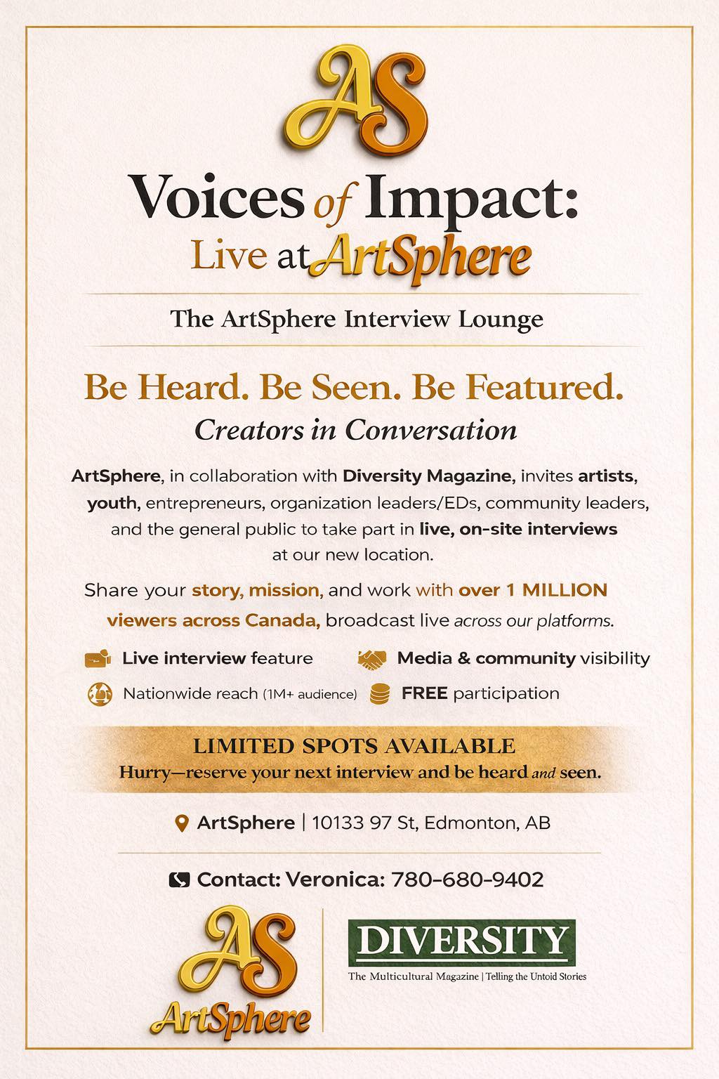 Toutes les entrevues auront lieu à ArtSphere, au 10133, 97 Street, pendant les heures d’ouverture, de 10 h à 18 h.